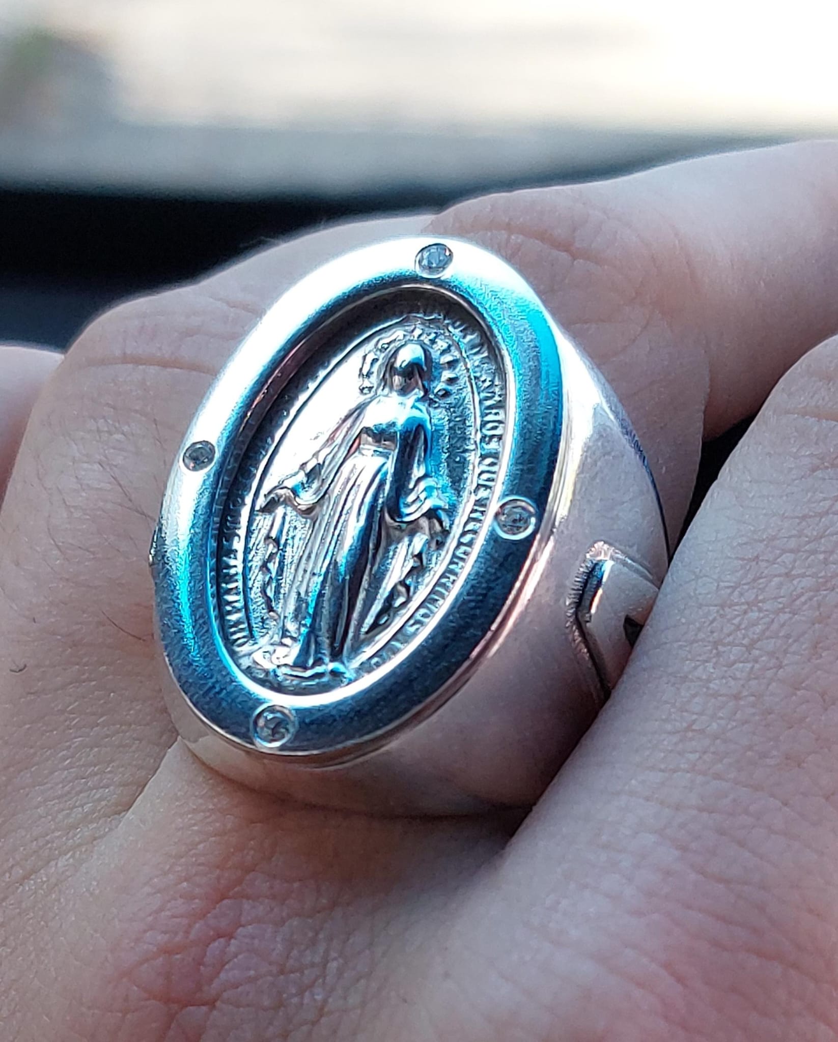 Anillo de la Virgen Milagrosa con iniciales en los laterales.