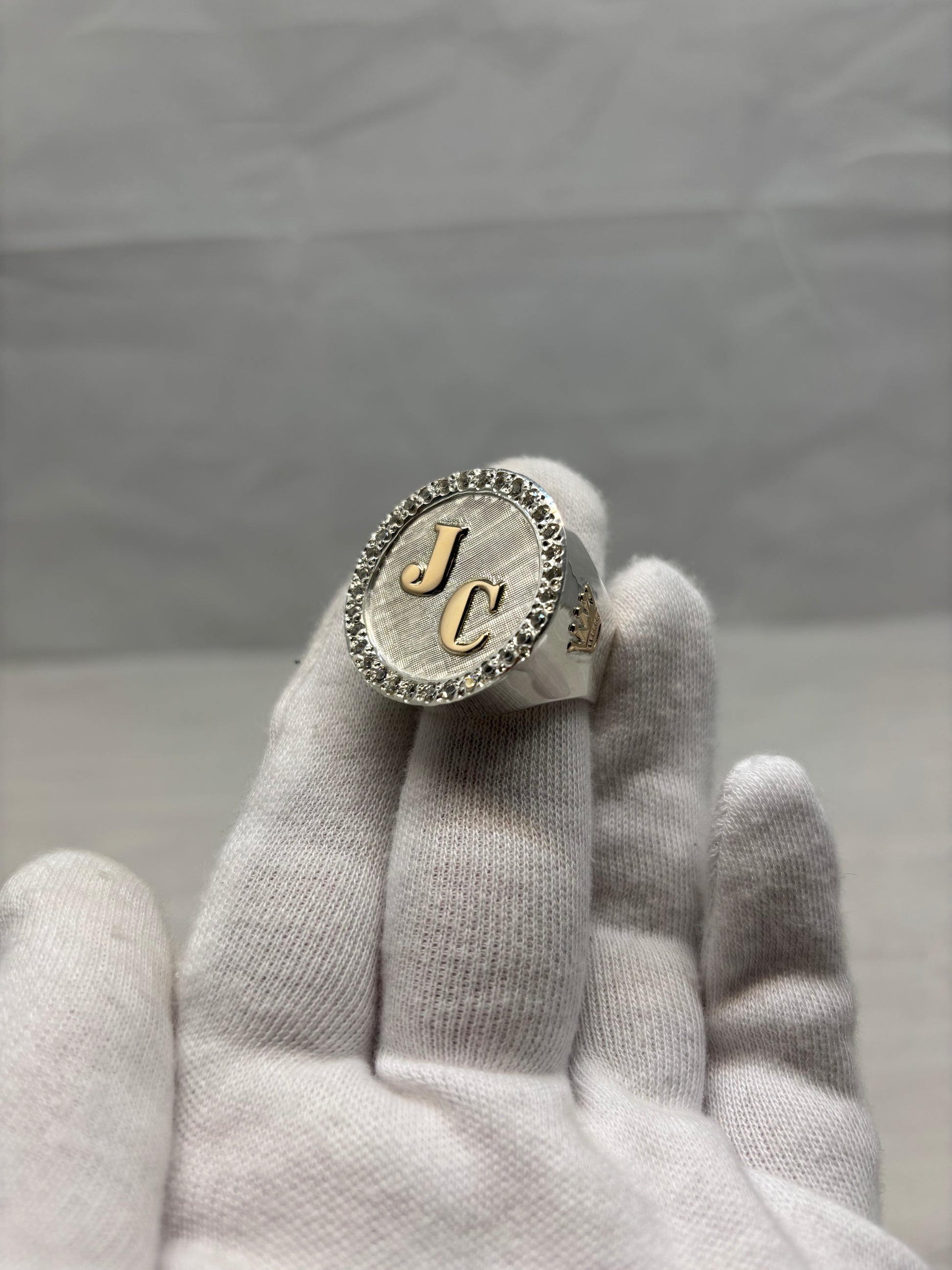 Anillo redondo con iniciales, apliques laterales y un marco de zirconias.